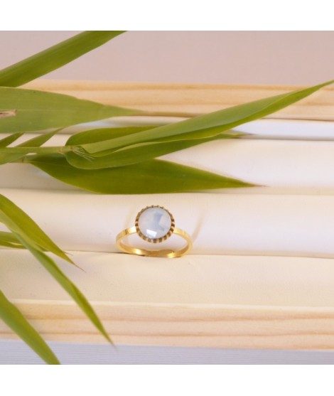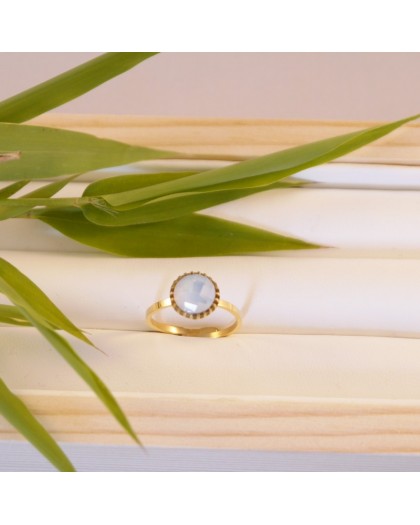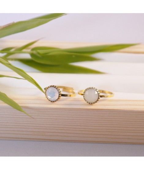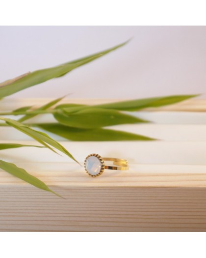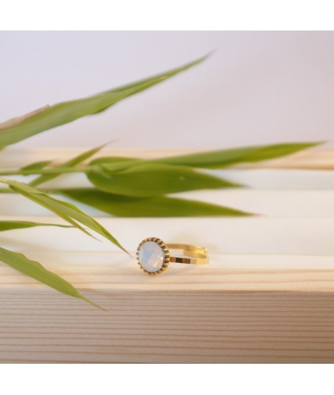 Bague dorée réglable en acier inoxydable avec strass blanc opaque.