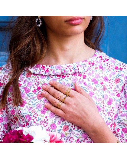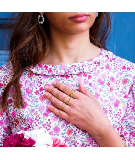 Discrète mais élégante, cette bague dorée ajustable en acier inoxydable et sa pierre rose de Rhodonite, apporteront une touche de douceur et de féminité.