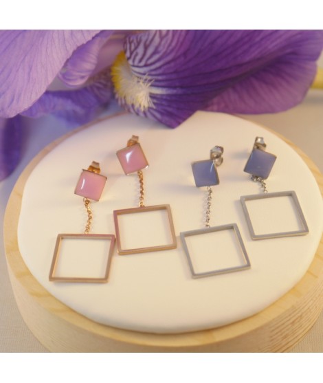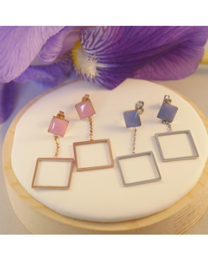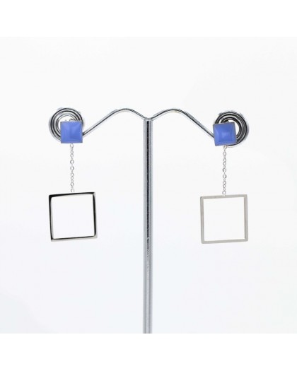 B.O. puce pendentif carrés émail bleu et argenté