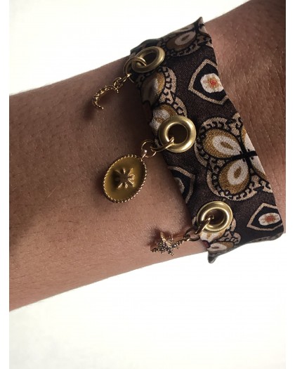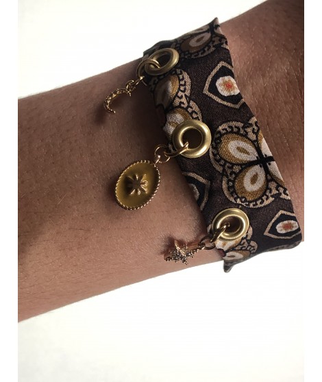 Bracelet tendance en foulard upcyclé 100% soie orné de charms en plaqué or. Ce bijou en imprimé est idéal pour faire rayonner un look simple. Fabrication française faite à la main, ce bijou est une pièce unique.